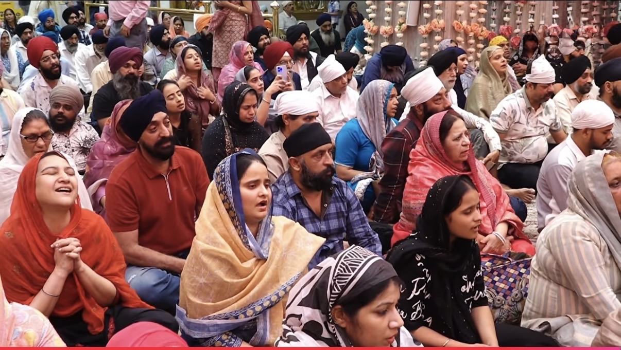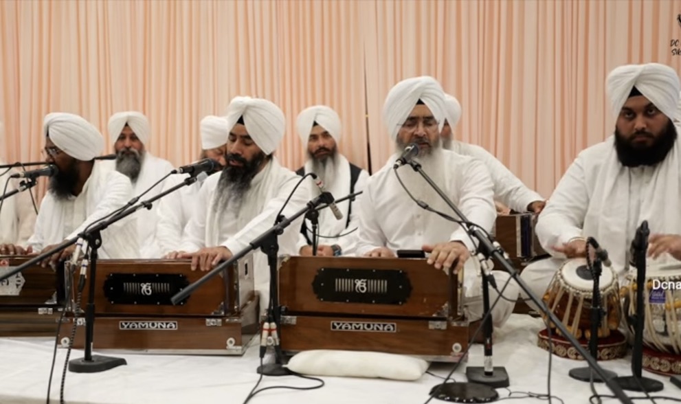 Professional musicians called Ragis perform the hymns using traditional instruments — the harmonium (a hand-pumped keyboard instrument), the tabla (a pair of hand drums), and the traditional sarangi (a bowed string instrument). The congregation sits on the floor and listens, or joins in singing, with heads covered as a mark of respect.