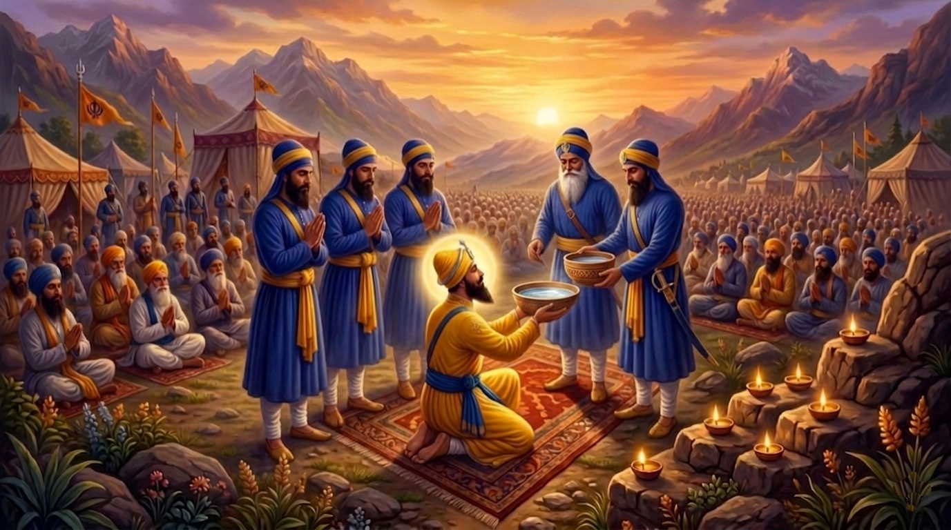 Having baptised the five beloved ones, Guru Gobind Singh Ji did something extraordinary and unprecedented in religious history. He knelt before the Panj Pyare and asked them to administer Amrit to him in the same manner. The five men who had moments earlier been his disciples now became his Gurus — baptising the Guru himself. In doing so, Guru Gobind Singh Ji declared one of the most profound principles of the Khalsa: that no human being stands above another in the eyes of God. The Guru and the Sikh are equal — bound together by the same Amrit, the same code of conduct, and the same commitment to justice and truth. This act of humility by one of the most powerful spiritual leaders in Sikh history remains one of the most moving moments in the entire Sikh story.